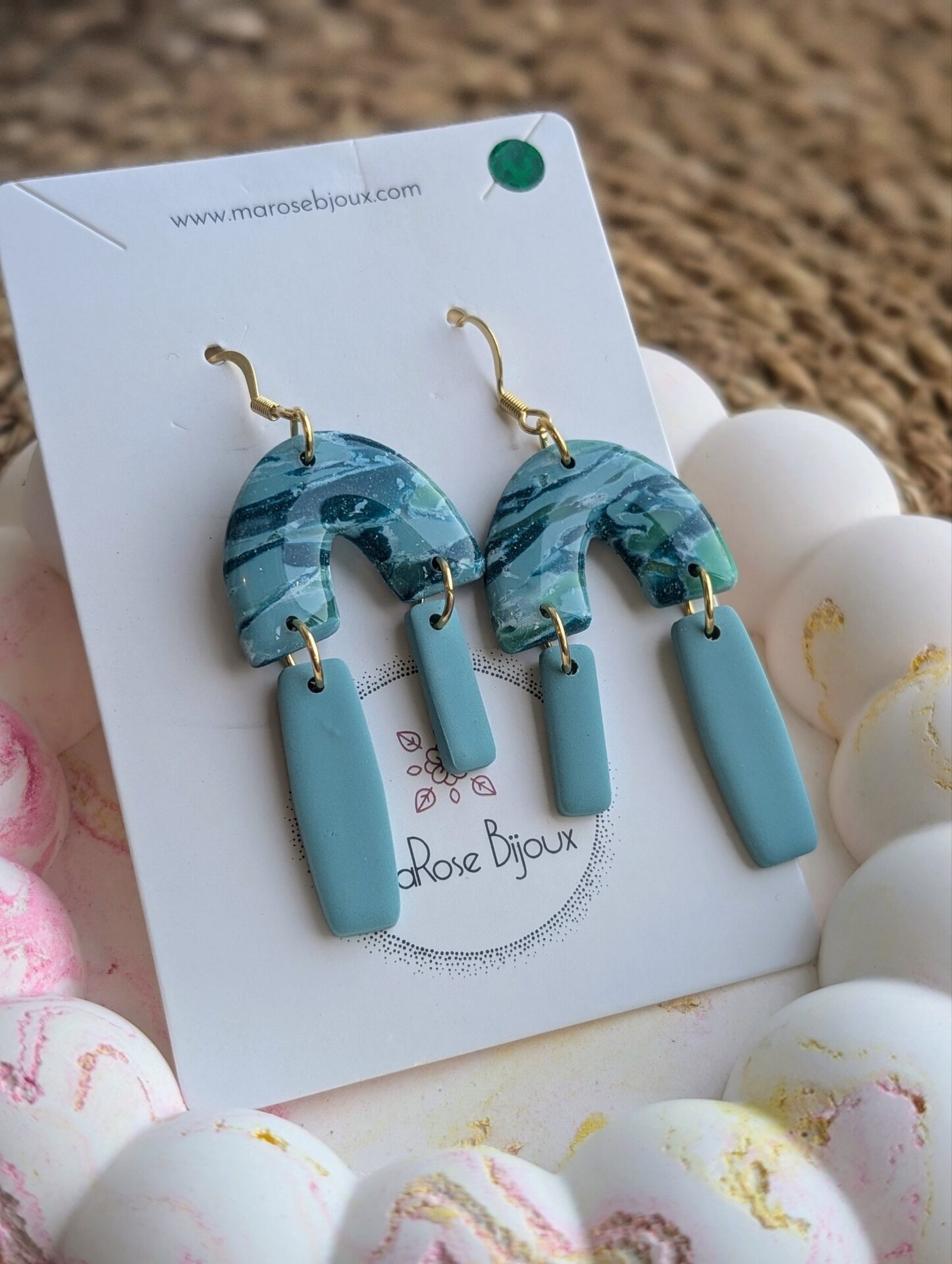 Entre marbrures vertes, nuances de jade et lavande, éclats dorés et motifs délicats, chaque pièce évoque l’harmonie du végétal et du minéral. Fleurs sauvages, formes géométriques, et colibris légers s’entrelacent pour créer des bijoux uniques, à la fois poétiques et modernes.