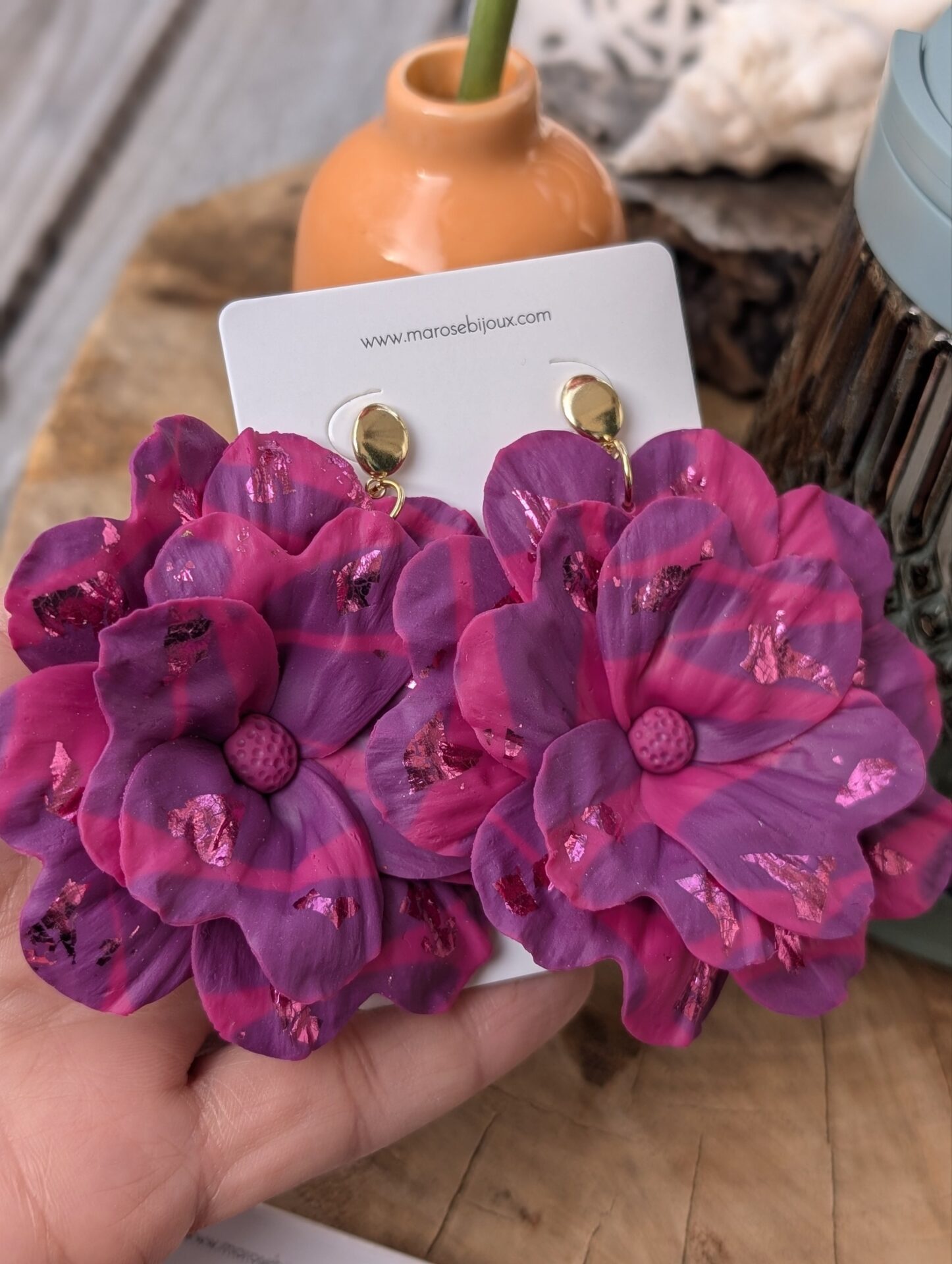 Cette maxi fleur en argile polymère se pare d’un orange métallisé aux reflets chauds et vibrants. Un bijou qui capte la lumière et apporte immédiatement chaleur et caractère à vos tenues hivernales…